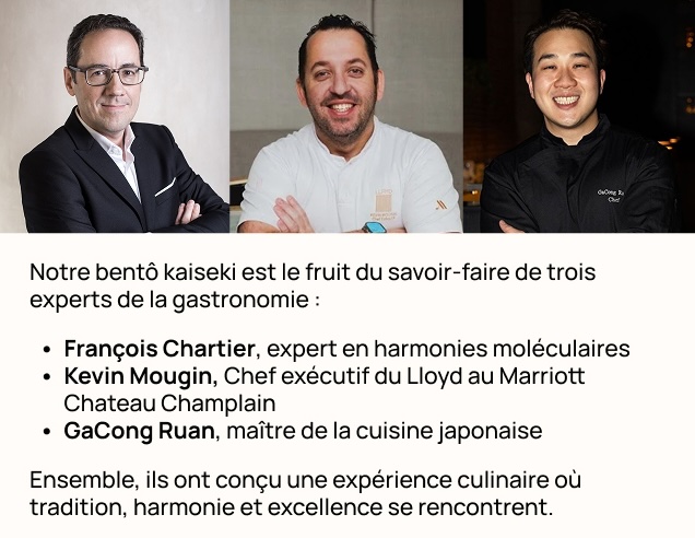 Connu mondialement pour sa maîtrise des molécules d’arômes et de saveurs, le maître Blender François Chartier vous fera découvrir ses sakés, élaborés avec art au Japon et nouvellement arrivés au Québec. Vous les apprécierez en mariage avec le menu qu’il a spécifiquement élaboré en collaboration avec le Chef de Nama Omakase et le Chef de l’hôtel Marriott Château Champlain, en harmonie avec les sakés.
